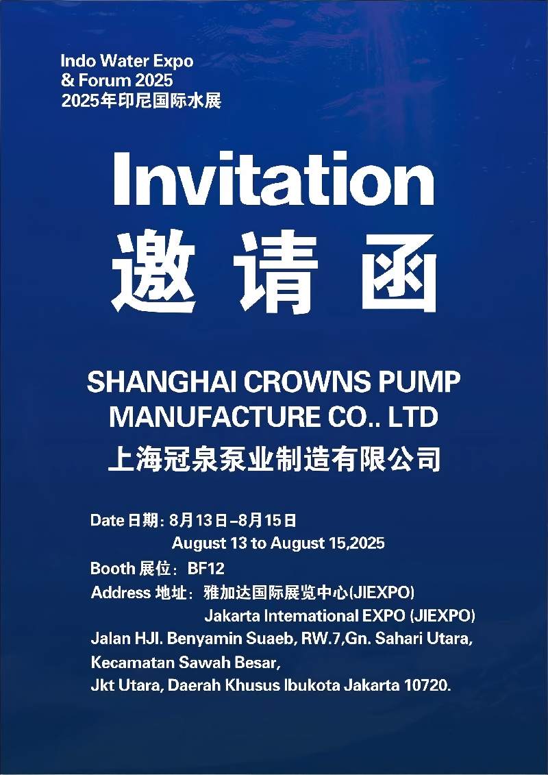 Ang Indo Water 2025 Expo & Forum, ang pang -internasyonal na kaganapan sa International Water and Wastewater Technology ng 19th Indonesia, ay gaganapin mula Agosto 13 hanggang Agosto 15,2025. Ang kaganapang ito ay makakonekta ang mga pinuno ng industriya, mga tagabago, at mga propesyonal upang ipakita ang pinakabagong mga teknolohiya at solusyon sa pamamahala ng mapagkukunan ng tubig, alkantarilya, pang -industriya na basura, paglilinis, patubig, at marami pa. Bilang isang dedikadong manlalaro sa sentripugal pump, fire pump,Submersible PumpAng sektor ng pagmamanupaktura, industriya ng bomba ng Guanquan ay tuwang -tuwa na maging bahagi ng prestihiyosong pagtitipon na ito - at mainit kaming inaanyayahan na bisitahin ang aming booth!